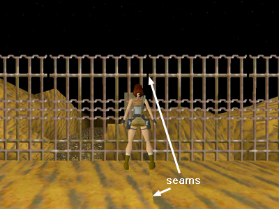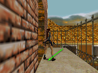 This variation on the fence bug was found by Joe C. and reported on tombraiders.com. It works in Tomb Raiders 1-3 in most locations where there is a concave corner in a fence or balcony (i.e., a thin texture with regular seams and open space on the other side).