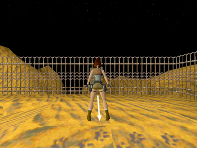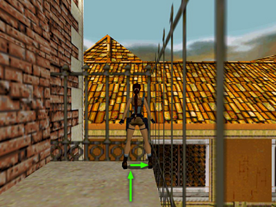 Position Lara against a fence just to the left of a seam between two textures. A good way to ensure correct positioning is to place her right foot just to the right of the seam between the corresponding floor textures. (screenshot 1)