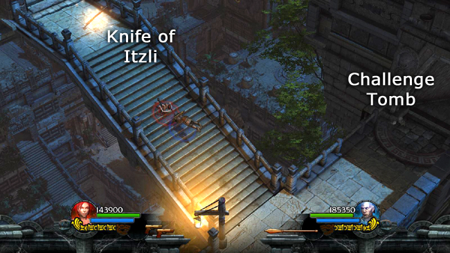 Continue up the stairs to the NW. At the top, you'll find the The Knife of Itzli Relic (Power Shot) sitting in plain sight. (screenshot) Take it and go through the door.
