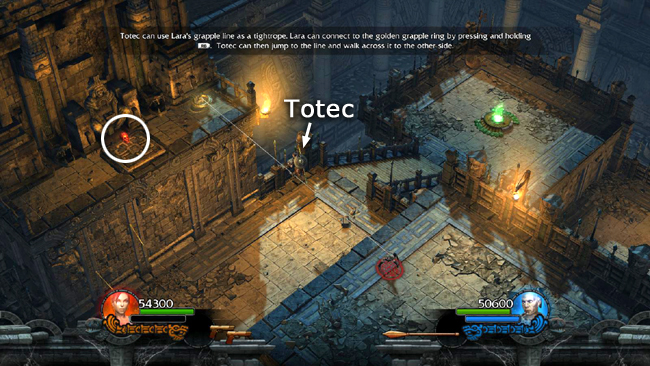 Totec's shield can also be used to lift Lara to higher places. The player controlling Totec should raise his shield. The player controlling Lara can then jump on top of it and then jump to grab the ledge above and pull up onto it. (screenshot) Lara should then extend her grapple down to Totec so Totec can climb the cable onto the ledge. (screenshot)