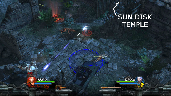 NORTH OF THE SPIDER TOMB: For now, continue along the circular road toward the north. You'll see the blue energy blasts from the 2 shamans ahead before you see them. Take them out, along with a few more lizards, and then move to the north edge of the ring road, where there's a SUN DISC already in place on the ground, and a broken bridge to the north. Use the checkpoint here, but don't follow the bridge; instead head back to the right (east).