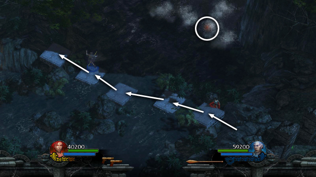 RIVER CROSSING: Just beyond this gap in the wall there's a spot in the river with a series of small, square stones. This is a good spot to try and cross the river without touching the water for the Reward Challenge. (screenshot) After hopping across, you'll need to move up onto the opposite bank in order for the challenge to register. If you don't make it the first time, you can return to the area where you found the AMMO UPGRADE and try crossing again. Success brings a HEALTH POWERUP.