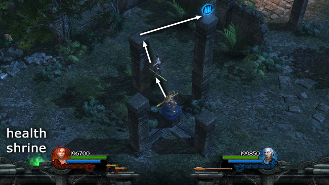 Step onto the stone bridge to the SE and fight a couple of shamans. Proceed down the stairs to an open area with a HEALTH SHRINE.