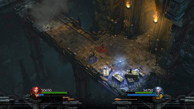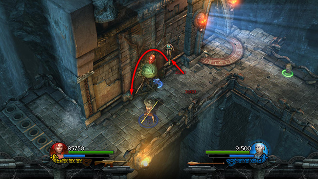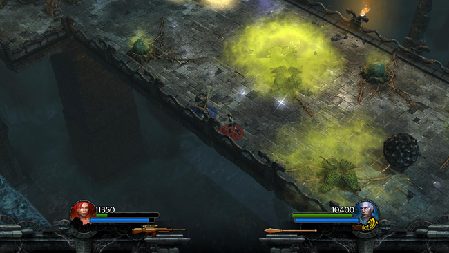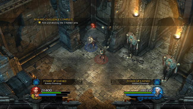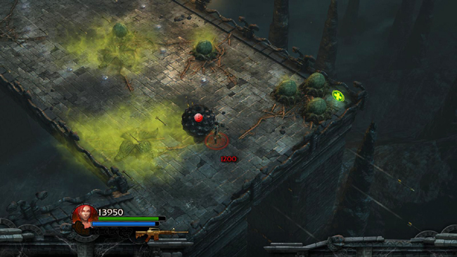 As your characters move forward, Totec on the left, Lara on the right, a giant swamp ogre appears behind Totec. More enemies, including skeletons and bogmen, spawn on both walkways. If you use careful teamwork, Totec can run forward and lure the ogre onto the spike field, which is retracted at first. Lara can then raise the spikes by moving onto the large pressure pad on her side. You don't get points for enemies killed by spikes, though, and approaching the pad causes more bogmen to spawn. So it might be easier to just stand your ground and shoot the enemies as they appear. Don't forget to blow up the skeletons' bones so they stay dead. (screenshots)