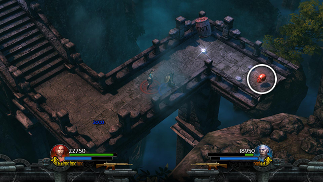 The path to the left (NW) is a dead end with some gems. If you hop across the gap in the walkway, several enemies, including an ogre, leap down upon you. Jump back across the gap and try to shoot them before they reach you. The ogre may drop health and/or ammo.