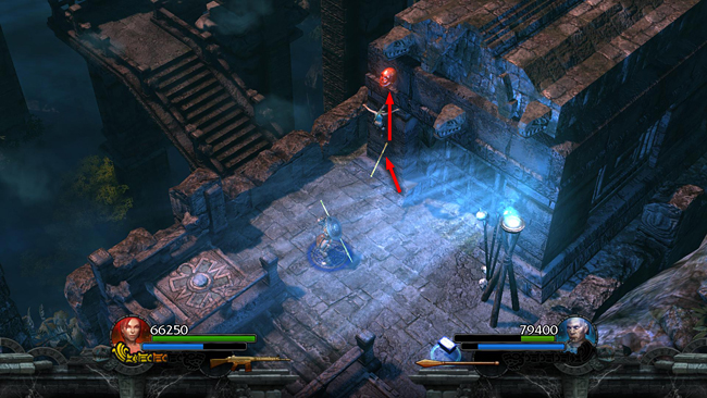 The path to the right (SE) leads down a flight of stairs, past some gems to a red skull (1/10). (screenshot) Another ogre and 2 regular enemies drop in. You can detonate the TNT at the corner of the walkway to do a little extra damage if you like. Pick up the health and/or ammo the ogre drops when you defeat it. Then return upstairs to the starting area.