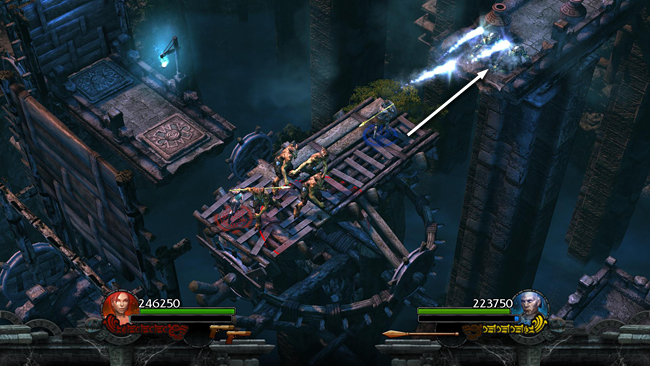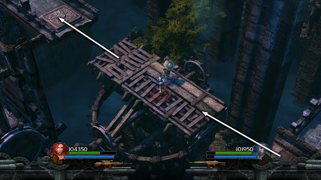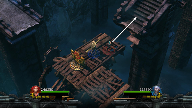 The exit from this room is on the NW wall. To open it, begin by having one character stand on the pressure pad on the right to raise the first of 2 wooden ledges to the NE. The other character should then jump onto this ledge and move to the top corner. As the first character moves onto the left pad, the other character needs to jump quickly onto the second ledge as it rises and the first collapses. He or she can then pull the handle to open the exit. As soon as you release the handle, it begins to retract. You must now move quickly to reach the door before it closes. The first character should move back onto the pad on the right. The second character must then jump back onto the first ledge as it rises and the other ledge collapses. Now jump back down to the floor and run through the exit before it closes. If you don't make it in time, you'll have to pull the handle and try again. (screenshots)