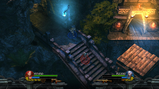 Lara should then hop over to the platform with the circular pressure pad just to the right (E). This raises the folding platform to the NE of Totec's position. He can then climb up past the golden ring, jump onto the folding platform and then jump from there to the solid platform to the left. Two shamans now appear. Each character can deal with one of them.