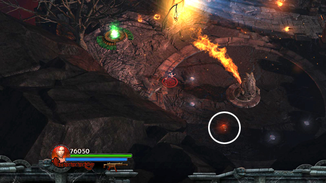 OUTSIDE THE ANCIENT CRYPT: At the top of the steps to the west of the MAIN GATE, is the blue-lit entrance to an ancient crypt (shown in the SW corner of the level map). Before going inside, use the HEALTH SHRINE if necessary. Then move carefully around the ring with the rotating flame jet to gather gems and a red skull (2/10). (screenshot) Take care of the red lizards that spawn near the crypt entrance.