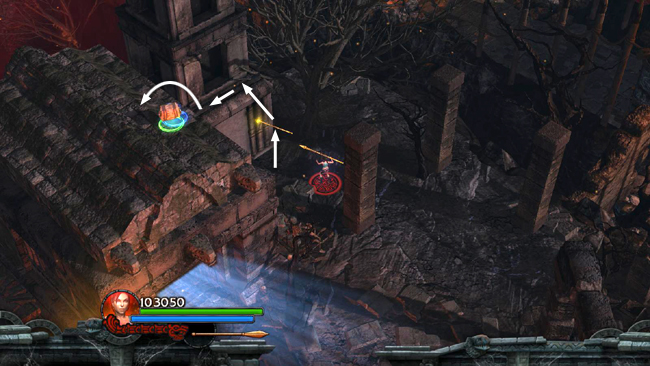 THE ARENA: Smash the urns just ahead on the right for a health pack. Then move into the arena, which consists of 3 rings with rotating flame jets. The third gatekeeper appears, along with several fire-breathing lizards. Flame vents also flare up, blocking the exits to the SE and W, preventing you from leaving this area until the fight is over.