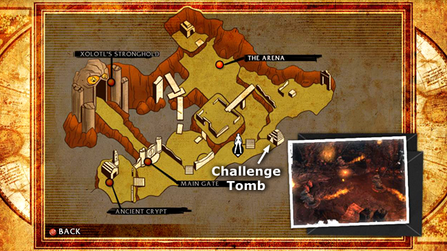 As you follow the road to the east, 2 fire golems spawn. Advance slowly to trigger the first one. Back up shooting until it is destroyed. Then advance again to trigger the second golem and take care of it. Pick up any dropped health and ammo. Continue east to the CHALLENGE TOMB entrance (located just above the top left corner of the inset photo on the level map).