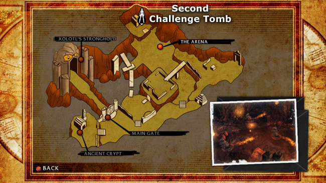 When the gatekeeper falls, the flames on the west side of the arena go out so you can exit. Pick up the GOLDEN KEY the gatekeeper dropped wherever it lost his shield. Then head to the west just until the next checkpoint registers. If you're in a hurry to finish, continue to the west and skip down to the “BROKEN BRIDGE” section, below. Otherwise, take a few minutes to pick up the remaining red skulls and explore the SECOND CHALLENGE TOMB.
