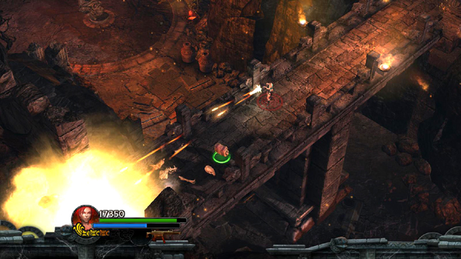 Meanwhile, several other enemies—including fire shamans, skeletons and fire-breathing lizards—join in. You can retreat back down the stairs to the north as you fight, but the exits to the east and west are blocked by flames until the battle is over. There's more health and ammo in the urns at the foot of the stairs to the east, and the gatekeeper drops health/ammo too.