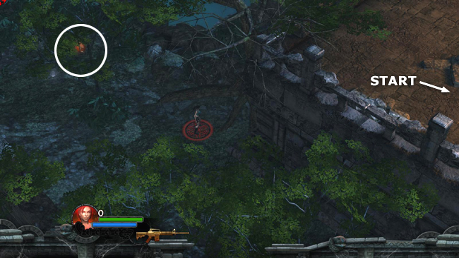 AREA EAST OF SPIDER TOMB: Start by heading to the right (NE) along the circular road surrounding the temple. Fight some lizards and pick up some ammo on the road, plus more ammo and health in the bushes to the left and right of the road.