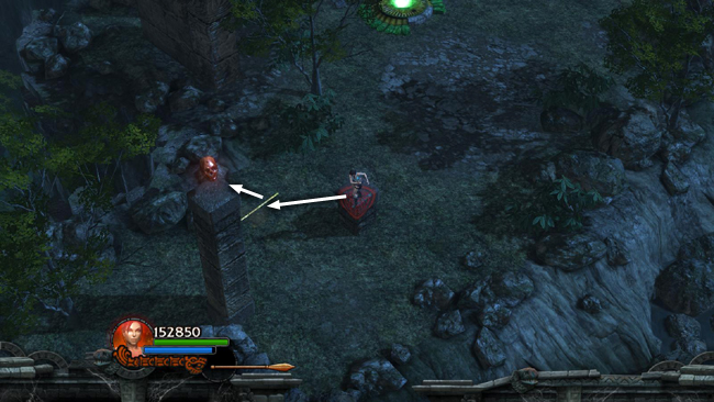 When the coast is clear, explore the area at the bottom of the stairs, picking up various gems in the grass and on the dais to the NW, health packs to the right of the stairs and behind the wall to the NW, plus any health/ammo the ogre may have dropped.