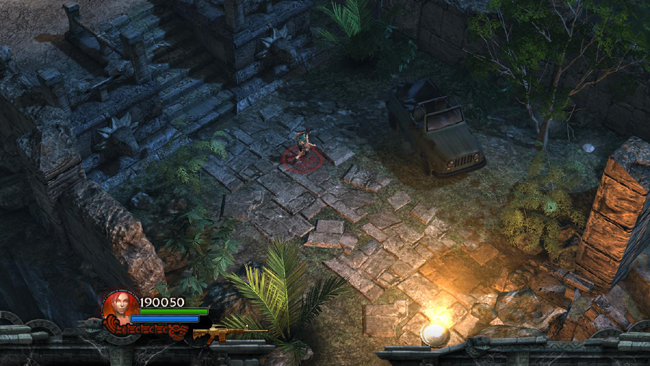 Now follow the stone road leading away from the stairs where you started. Soon you'll come to a clearing with some trucks. After a short cut scene showing Xolotl's undead warriors slaughtering some mercenaries, prepare for an onslaught of enemies from the NW. The shamans fire blue energy beams, which you should try and dodge if possible. The square columns also offer some cover. Watch out for various lizards that spawn around you as you fight the larger enemies.