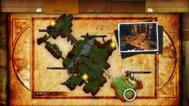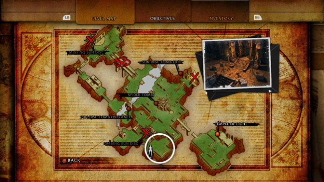 OPENING THE SPIDER TOMB: When you approach the tomb carrying the third and final SUN DISC, a cut scene shows the top of the structure lifting up to reveal an entrance. If you managed to open the tomb in under 5 minutes, you'll receive a Gold Owl Artifact (+ defense), per the second Reward Challenge.