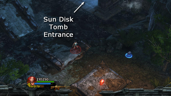 NOTE: A tomb containing one of the SUN DISCS is located at the top of the long staircase, on the NE side of the map, but I recommend saving that one for last. If you go for the discs in the north and west first you'll end up doing less backtracking overall.