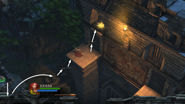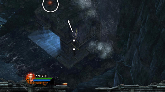 Now return to the clearing to the NE, where you'll find a HEALTH SHRINE. There are also five square columns with an AMMO UPGRADE on top of the tallest one. To reach it, stand on the center pillar, throw a spear into the pillar to the NW and use it to climb onto that pillar. Jump from there to the pillar with the upgrade. (screenshot)
