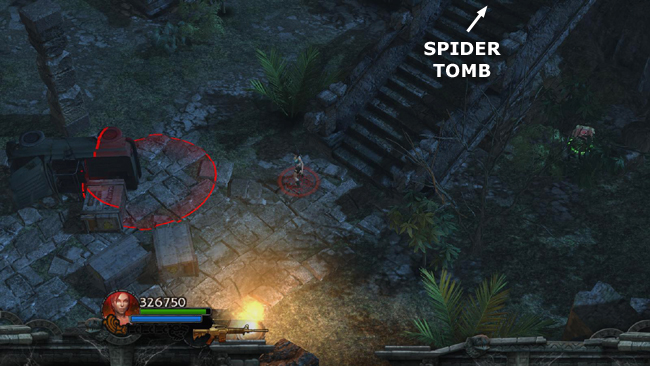 AREA WEST OF SPIDER TOMB: Another ambush awaits you here, with enemies large and small converging on the clearing at the bottom of the stairs. A few also come down the stairs from the tomb area. Again, it may help to run up the stairs, drop a bomb, and detonate it when enemies approach.