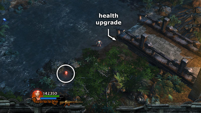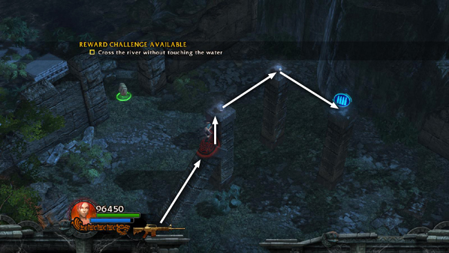 RIVER CROSSING: Just beyond this gap in the wall there's a spot in the river with a series of small, square stones. This is a good spot to try and cross the river without touching the water for the Reward Challenge. (screenshot) After hopping across, you'll need to move up onto the opposite bank in order for the challenge to register. If you don't make it the first time, you can return to the area where you found the AMMO UPGRADE and try crossing again. Success brings a HEALTH POWERUP.