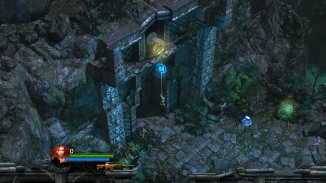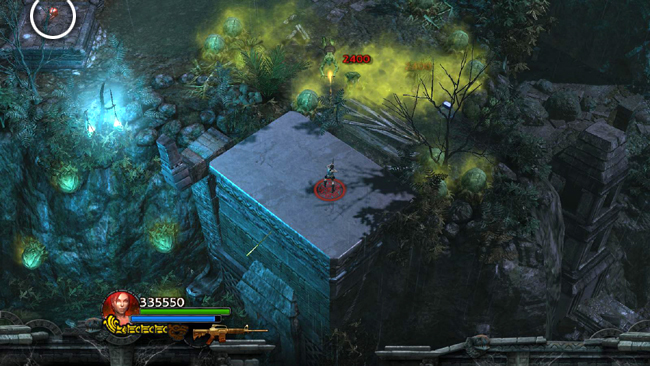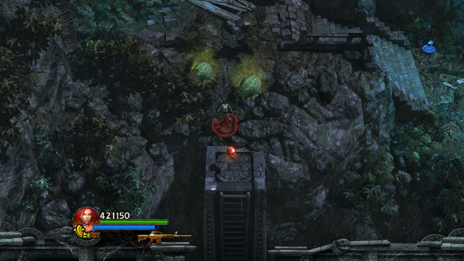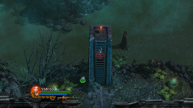 LEVEL EXIT: Cross the rickety plank bridge to the NW. After a short cut scene in which Xolotl taunts Lara once more, approach the overgrown ruins. The pods in this area are not active yet. So if you're not doing the time challenge, take a minute to explore this small island gathering gems. Go up the stairs on the left and circle all the way around back to emerge on the ledge to the right of the big door.