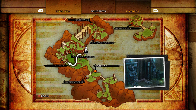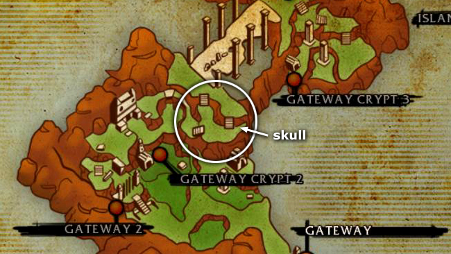 If you're not interested in challenges and loot, you can immediately enter the SECOND GATEWAY CRYPT, which is the doorway with the blue light shown in the last cut scene. (screenshot) It's also marked on the level map. (Skip down to that section of the walkthrough, below.)