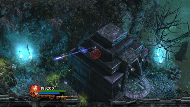 SECOND GATEWAY: As you exit the crypt, 3 shamans appear at the top of the ramp. Run up and take them out. Again, the spear at close range works well against these guys. Now head NW toward the giant gate you just opened. There's ammunition near the foot of the stairs leading up to the gate and health to the right of those stairs—provided you didn't pick it up earlier when you fought the swamp ogre. Gather some gems at the top and then go through the gate.
