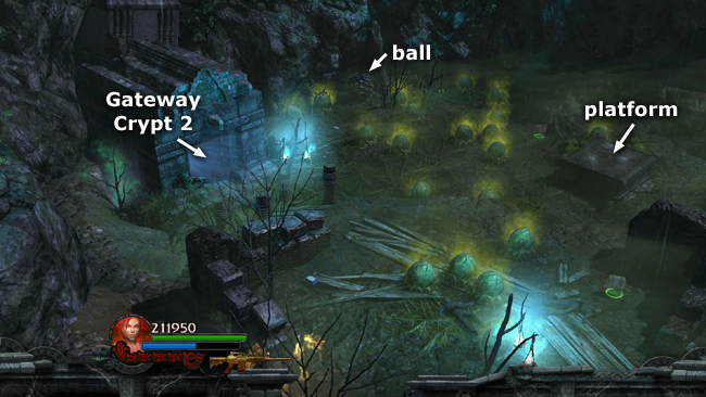 NOTE: When you first obtain the ball, instead of rolling it toward the crypt, you could also blast it up the tiered edge of the drained pool onto the elevated pathway to the west. This is tricky though, and more often than not the ball overshoots the path and lands in the pit at the base of the tall tower, making it difficult to move without triggering the nearby pods. I found it much easier to use the wooden walkways and ramps.