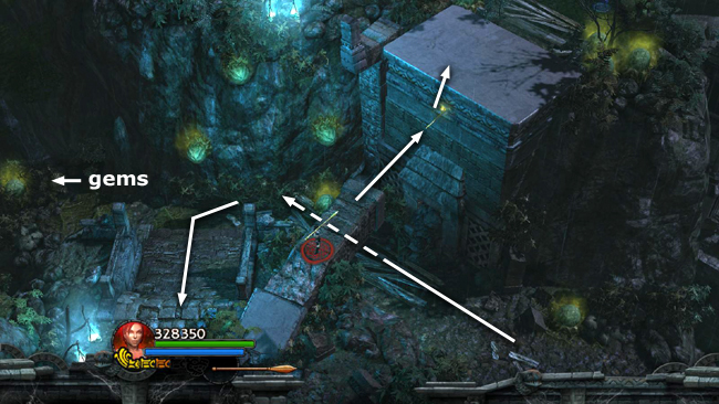 Head down the steps to the east. Throw a spear or two into the cliff wall ahead and climb onto the plateau above. Head to the south to find a large cache of gems. Drop down on the north side of the plateau, bypassing the path leading away from the starting area. (screenshots)