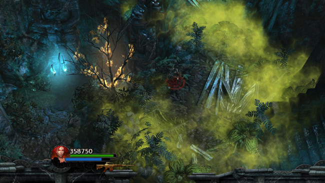 Proceed northward. A short cut scene shows a pair of lizards approaching. They trigger some of the pods, causing a column to collapse and crush them. When you advance, a pack of lizards attacks. Try not to trigger the poison pods beside the path as you fight them.