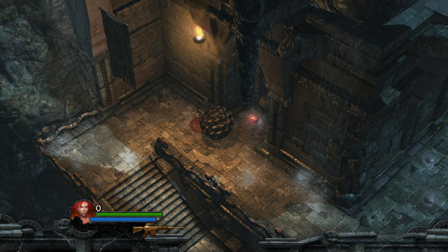 TRAPPED WALKWAYS: There are ammo and health pickups near the start, which you probably won't need. Jump across the gap in the walkway, climb the stairs and pull the large ball out of the alcove to find a red skull (1/10) and some gems. (screenshot)