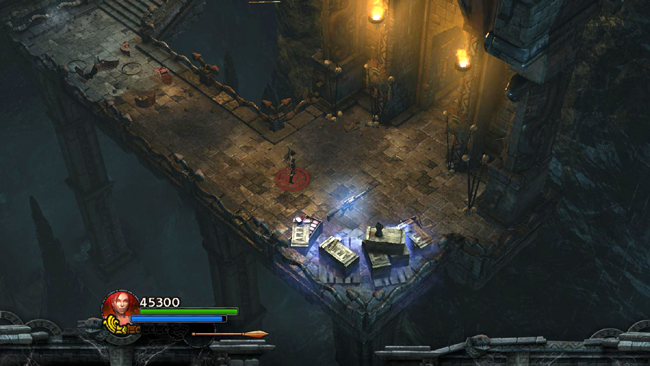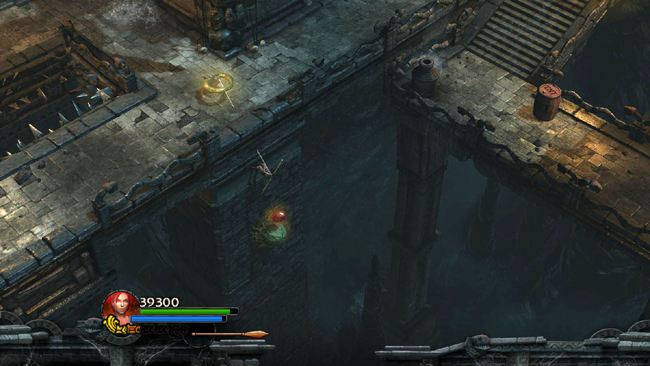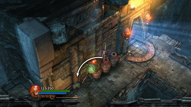 There's an ogre at the top of the stairs but, again, you only need to kill him if you're after the points. Otherwise, step on the pressure pad to release the giant ball balanced above. When it falls, it will squash the ogre. But before that happens, you need to run as fast as you can back down the stairs. Avoid enemies, pods and holes in the floor. At the bottom, veer onto the broken walkway to the SW to get out of the way as the giant ball crashes through the wall on the right.