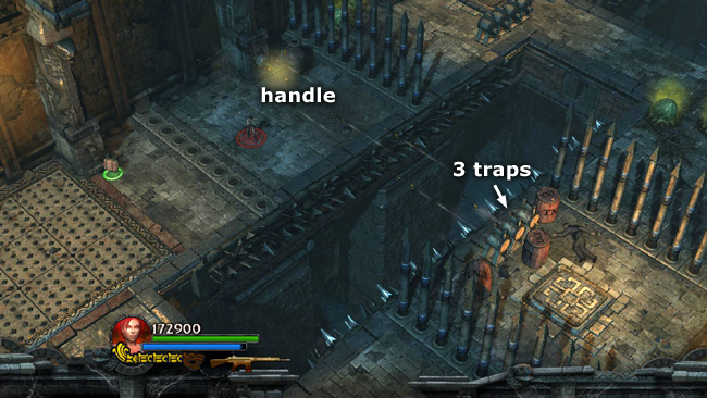 With the arrows no longer flying, you can safely pull the golden handle on the left wall to lower the next barrier on the opposite side of the room. The handle starts to retract so quickly run/roll around to the south then NE to get past the barrier before it rises again. Now you should be in the area on the right where the arrow traps were. Step on the square pressure pad to lower the barrier just ahead. Break the urns to get more ammo and continue forward (NE).