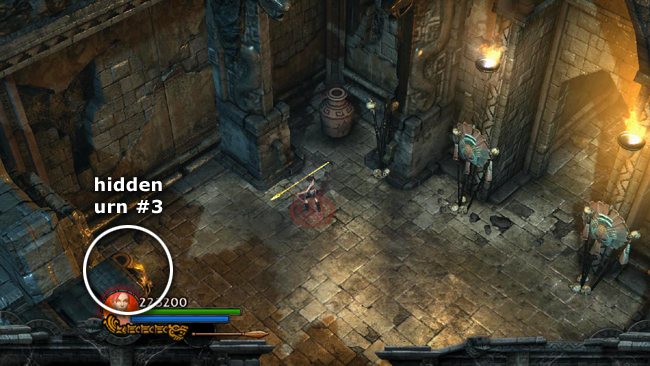 Continue to the end of the walkway. Just around the corner to the left, you'll find the first hidden urn (1/3) you must smash for the Reward Challenge. The on-screen message about hidden urns is a tiny clue. ;) (screenshot)