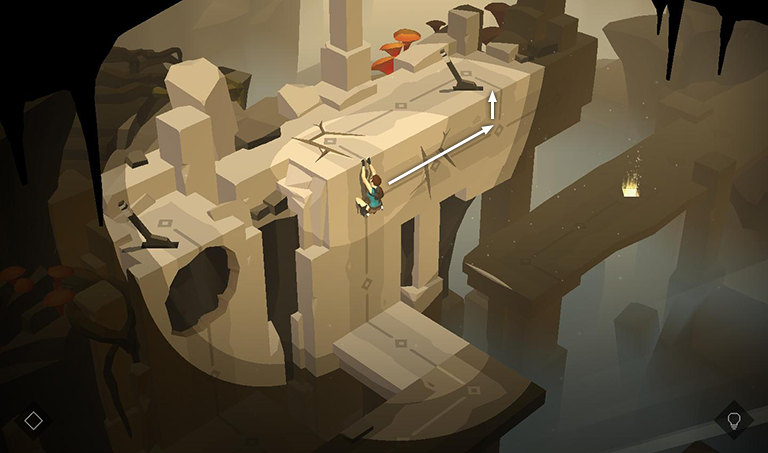 Now climb the wall until Lara is clinging onto the ledge above. Swipe right to shimmy along the ledge past a section of cracked wall. Then pull up next to a second lever.