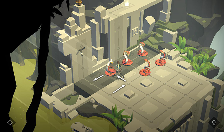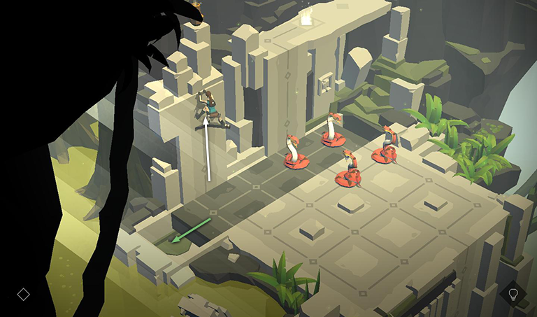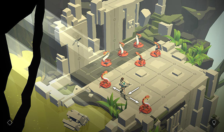 There's a snake blocking the path ahead. Enemies like this can kill Lara if you are not careful. Since the game is turn-based, the angle of approach is crucial. Notice how the snake is oriented, facing away from Lara. As long as you approach from behind, you'll be safe. Swipe to move toward the snake and Lara will automatically shoot it clearing the path.