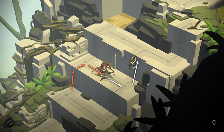 When you climb onto the ledge above, the second lizard spots Lara and begins to move toward her. Like Lara, it can only move one space per turn. So you can use this to your advantage.