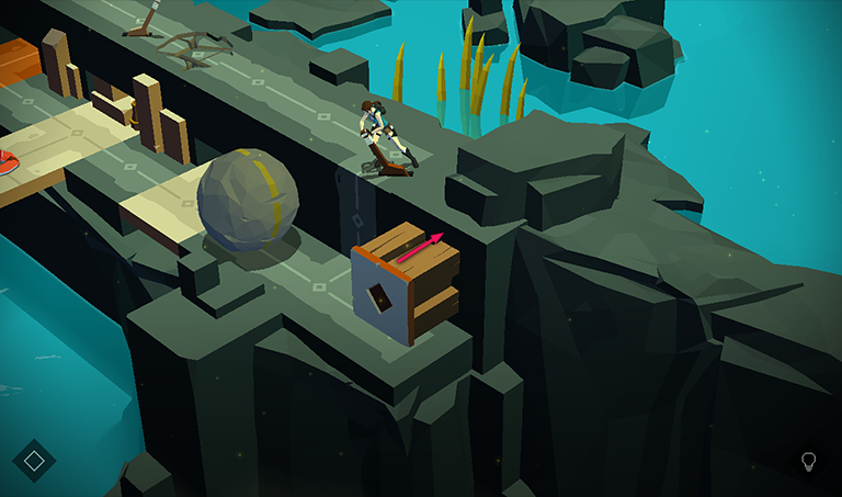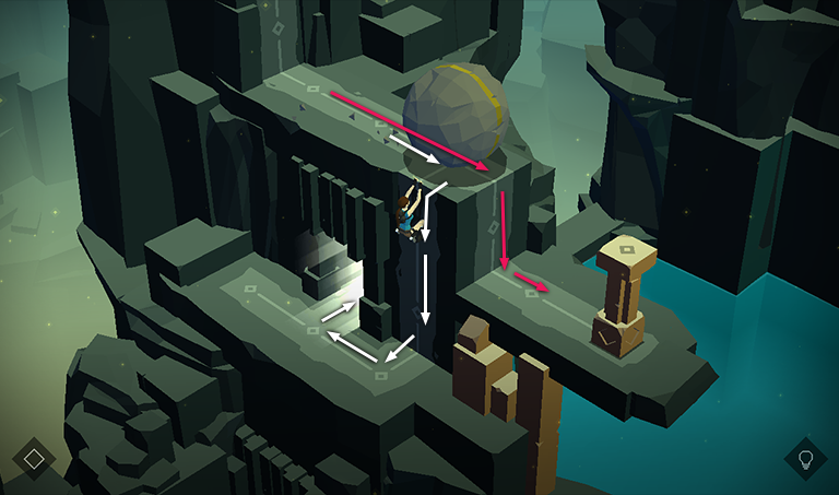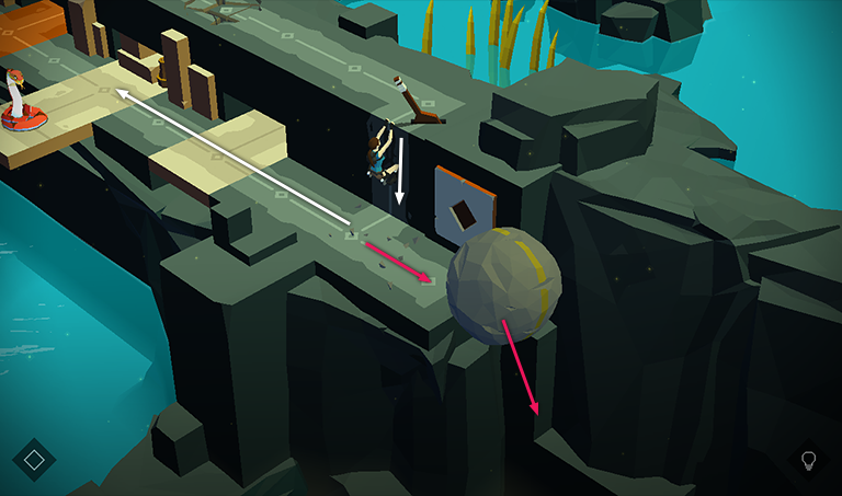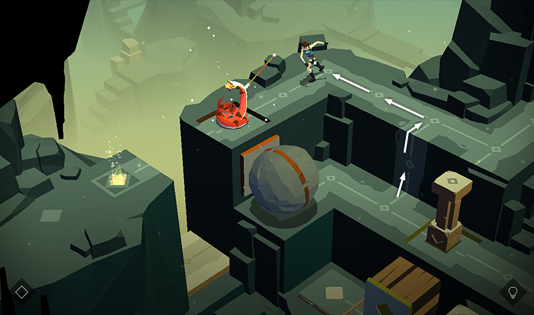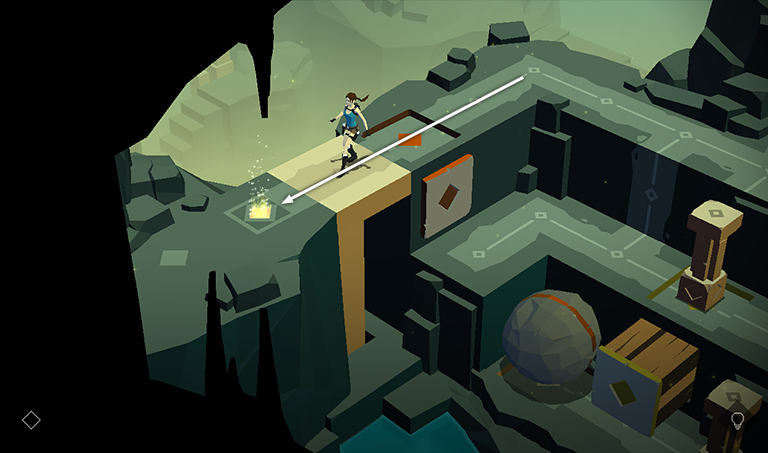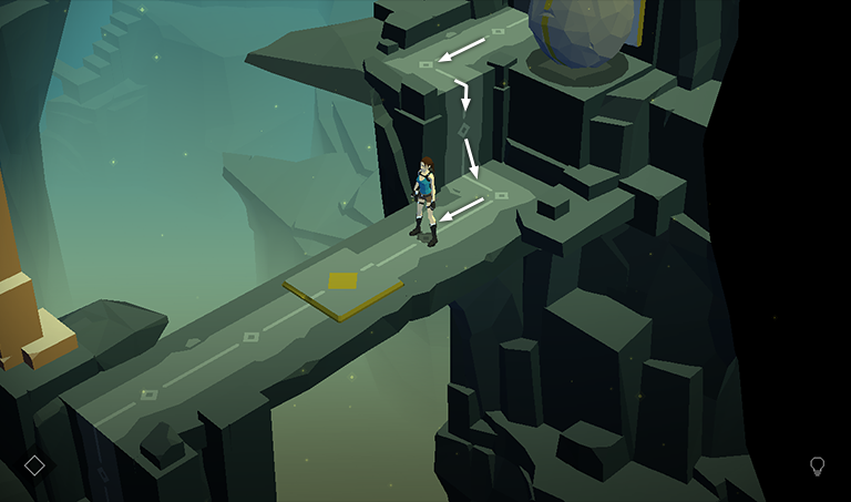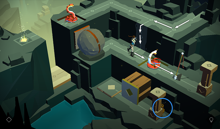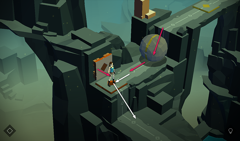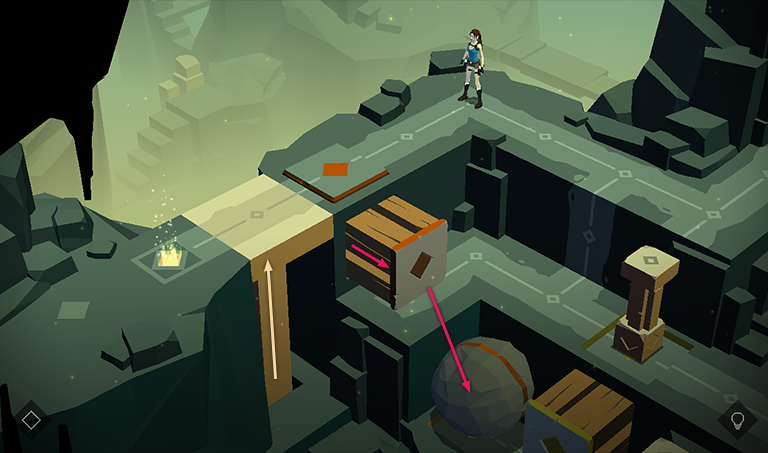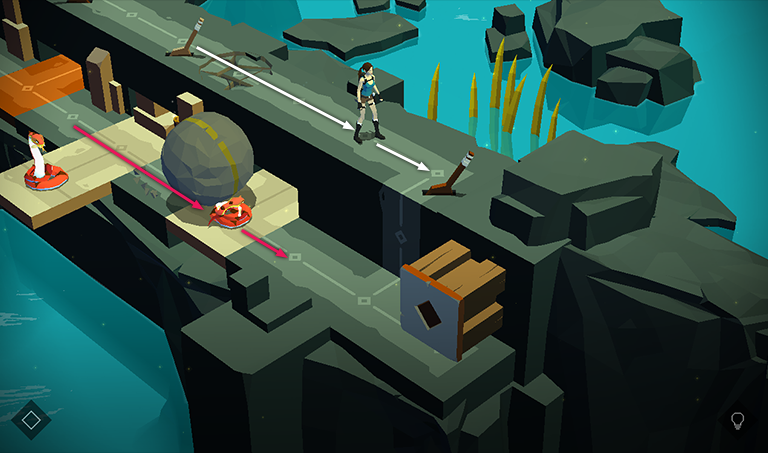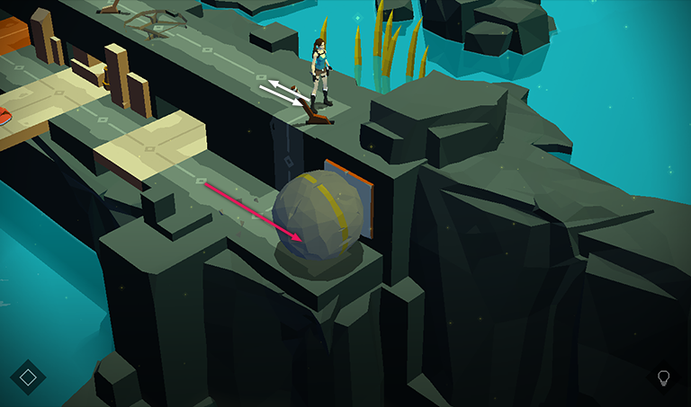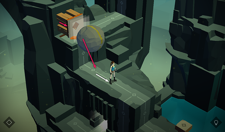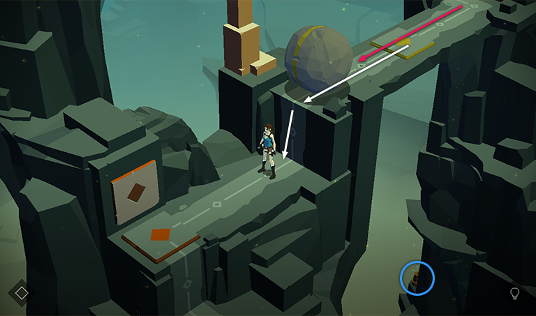 When Lara steps on the pressure pad with the yellow diamond, the block trap behind the boulder is activated, pushing the boulder off the ledge. Like Lara, the boulder only moves once per turn, so as long as you stay ahead of it, you're safe.