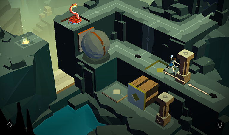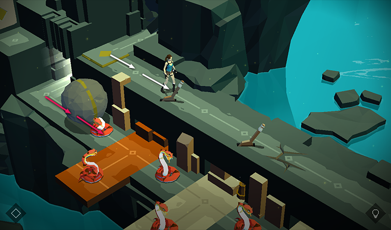 Move to the right until Lara is standing next to the first lever. As you go, the boulder rolls two spaces to the right, squashing the first of several snakes on the ledge below.