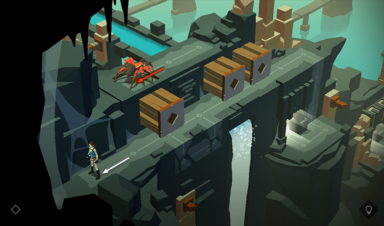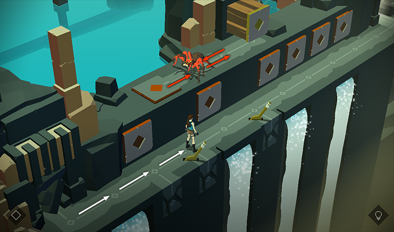 Pull up and move to the right twice until Lara is standing next to the second lever. Meanwhile, the spider moves two spaces to the right, then one to the left.