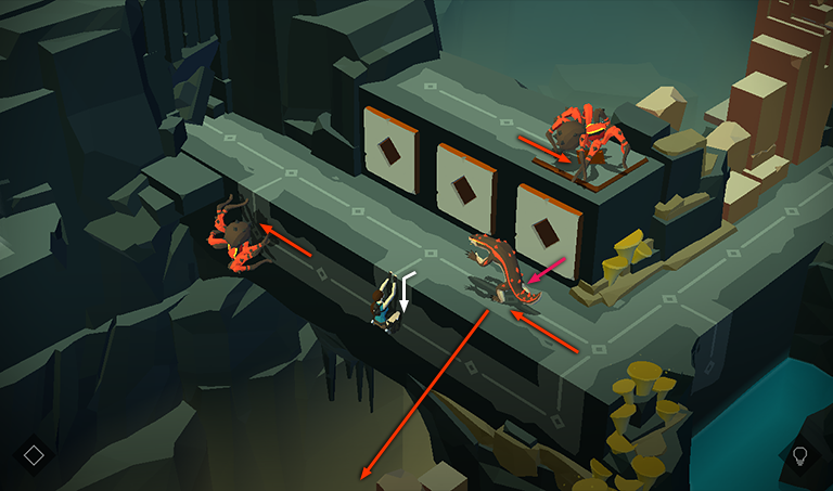 Climb onto the ledge and step forward once to get the attention of the lizard blocking the path to the level exit. Meanwhile, the spiders have both moved two spaces to the left, causing the one above to trigger the block traps again.
