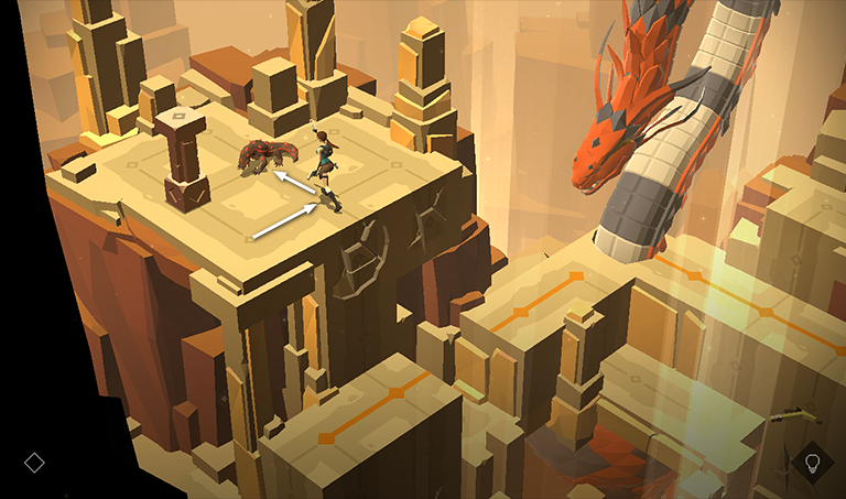 The lizard notices Lara immediately. To outsmart it, move to the right, then forward, then left twice, until Lara is standing just below the movable pillar. The lizard follows two spaces behind.