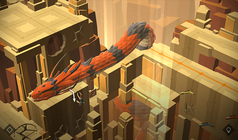 Move to the right along the orange line. Then climb up, past the cracked wall, onto the ledge with the lizard. Meanwhile the QUEEN makes her way back around to the hole where she started.