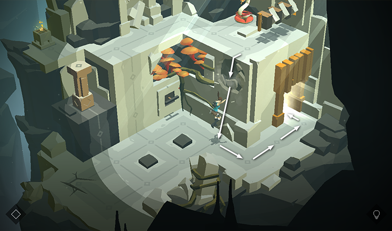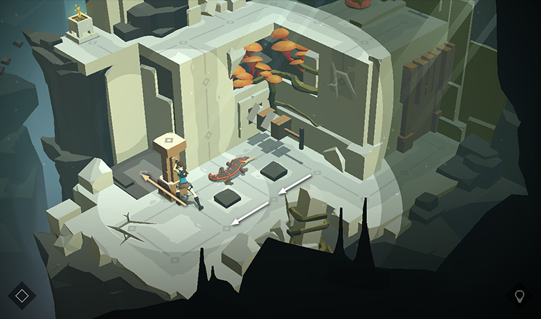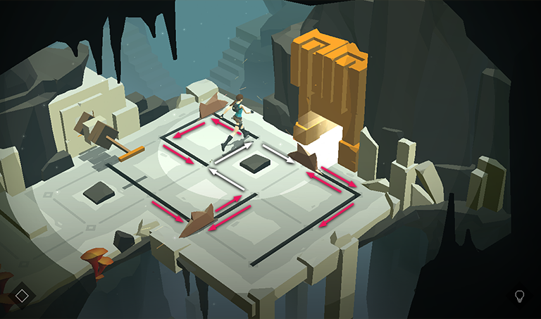 Then pull the switch by tapping/clicking the arrow icon on the floor. (If you're using a controller, hold Y/Triangle and move the left stick to pull the switch.) This opens the door off to the right. As you'll see, as soon as Lara moves again, the switch begins to retract and the door begins to close. You'll have six turns to reach it before it shuts completely. If that happens, you must to return to the switch and pull it again.