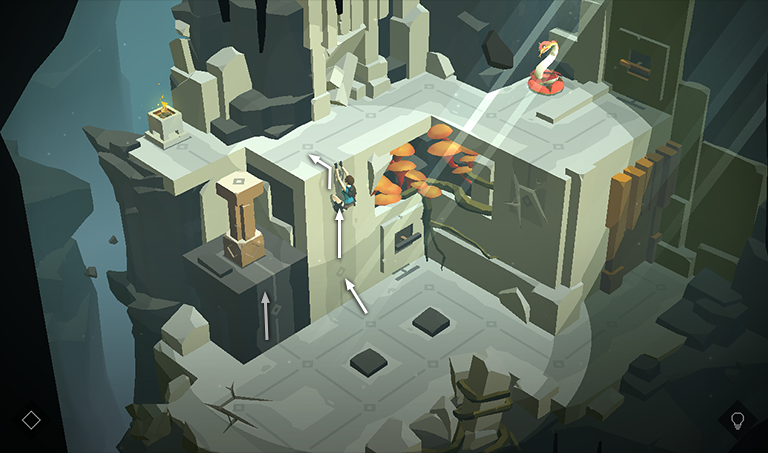 Welcome to the final chapter of the main story. Here we are introduced to another new mechanic inspired by classic Tomb Raider games: the timed door. Naturally this works a little differently in a turn-based setting, but the basic idea is the same. Start by climbing onto the ledge and moving to the right.