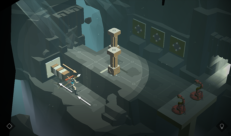 Then pull the upper pillar twice to the right. By the time the switch retracts and the arrows start flying again, Lara should be out of the way.