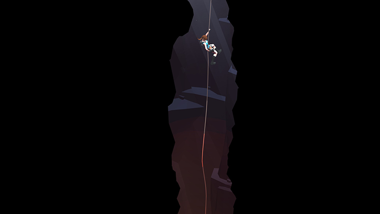 This new area begins with Lara abseiling into a dark, rocky shaft.