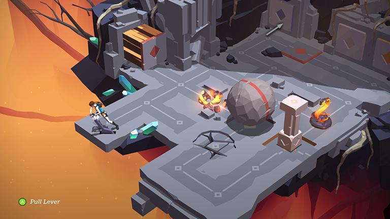 Move around to the lever in the left corner. As you go, the boulder rolls forward crushing the second snake and landing on the tan pressure pad. This retracts the tan block trap. The movable pillar prevents the boulder from rolling farther, so the tan block remains retracted.
