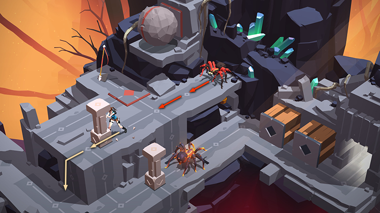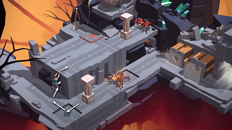 Push the second pillar twice to the left, so it falls off the edge onto the walkway below. The spider turns and moves back toward Lara, but it's still several spaces behind her.